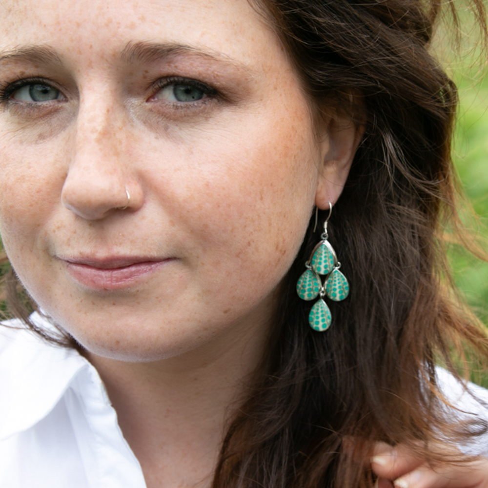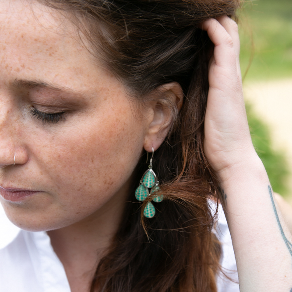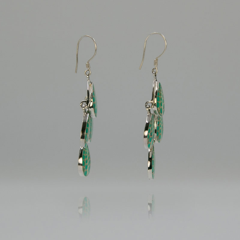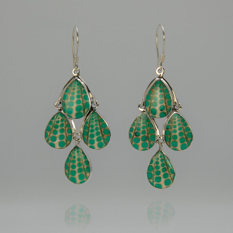 Boucles d’oreilles en argent 925 composées de quatre gouttes en oursin turquoise, serties d’argent 925.